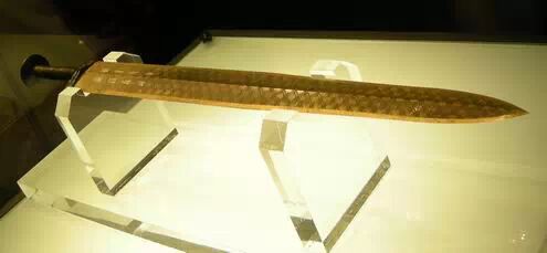 湖北省博物館越王勾踐劍劍身修長,有中脊,兩從刃鋒利,前鋒曲弧內凹。寬格上鑄陽文鳥篆書“越王鳩踐,自作用劍”。莖上兩道凸箍,圓首飾同心圓紋,鑄工精湛,被稱為“天下第一劍”。