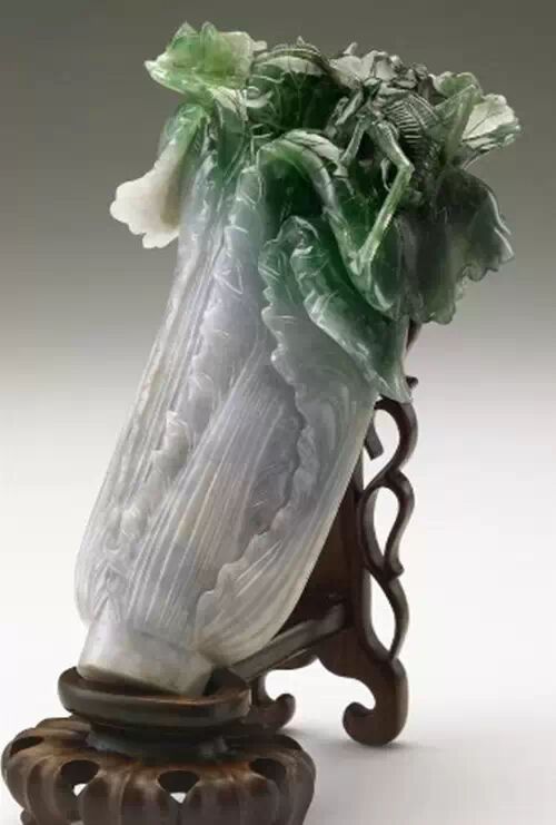 台灣 台北故宮博物館:翠玉白菜這棵翠玉白菜由一塊半白半綠的翠玉為原材料,綠色的部分雕成菜葉,白色部分雕成菜幫,看上去是鮮活欲滴。菜葉上還停留著兩隻昆蟲,它們是寓意多子多孫的螽斯和蝗蟲。