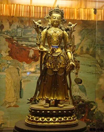 青海省博物館銅鎏金觀音造像由明朝皇帝賜給青海著名的瞿壇寺。像高146厘米,身姿婀娜,站立在蓮花座上。衣飾線條流暢飄逸,麵含微笑,表情慈和,遍體鎏金。其鑄造工藝代表了明代的最高技術水平。