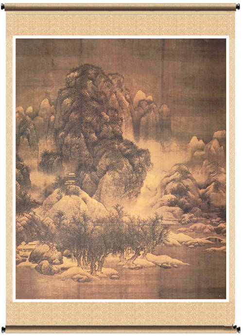 天津博物館《雪景寒林圖》(範寬)此圖畫群峰屏立,山勢高聳,深穀寒柯間,蕭寺掩映;古木結林,板橋寒泉,流水從遠方迂回而下。真實而生動地表現出秦隴山川雪後的磅礴氣勢。筆墨濃重潤澤,皺擦多與瀉染,屑次分明而渾然一體,細密的雨點皺於蒼勁挺拔的粗筆勾勒,表現出山石和枯木。