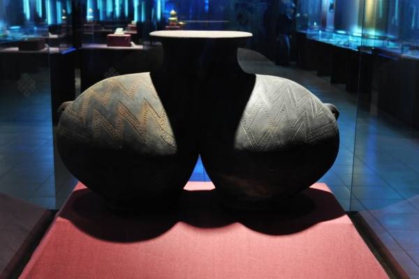西藏博物館雙體陶罐 出土於昌都卡若遺址,造型洗練優美、飽滿豐盈、構思巧妙,製作工藝純熟,代表了卡若文化的製陶水平和卡若先民高超的器物造型能力,是新石器時代西藏陶器的代表和點睛之作,也是西藏博物館的鎮館之寶。