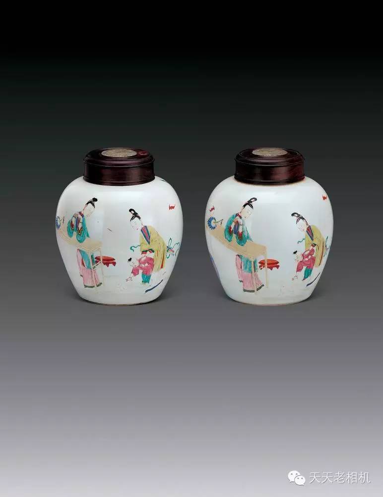 雍正粉彩四妃十六子罐(一對)