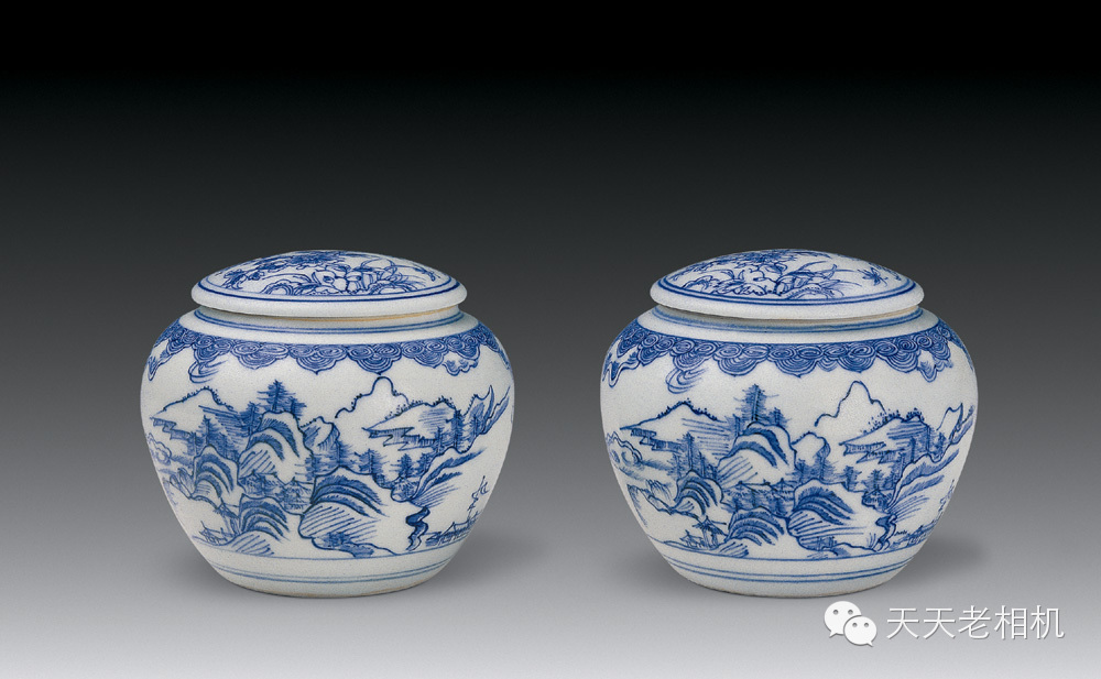 雍正 青花淡描山水紋圍棋罐