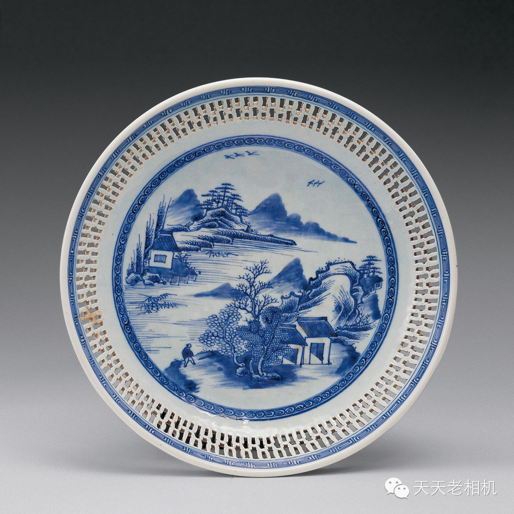 雍正 青花縷空山水人物盆