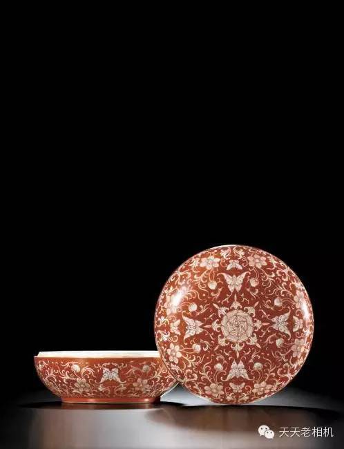 雍正礬紅彩留白「彩蝶戲花」圖圓蓋盒