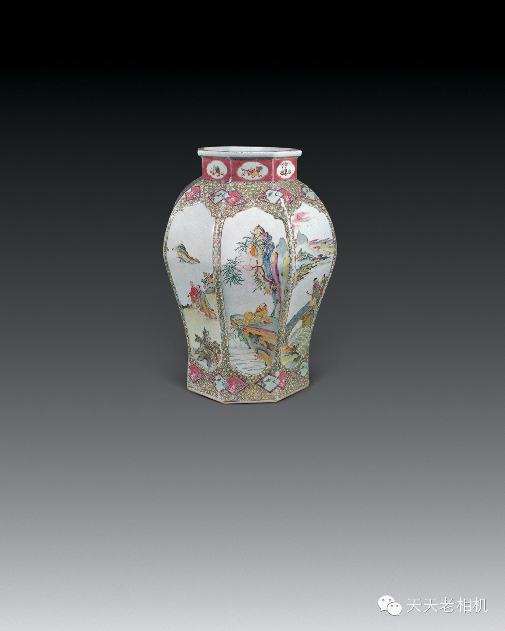 雍正粉彩八麵開光山水人物大罐