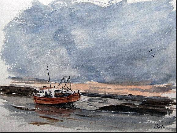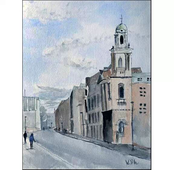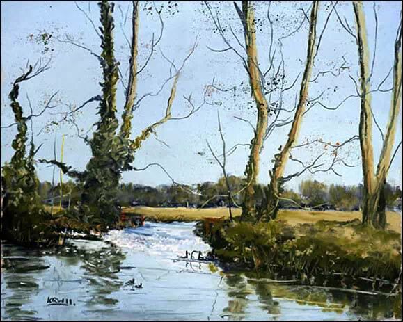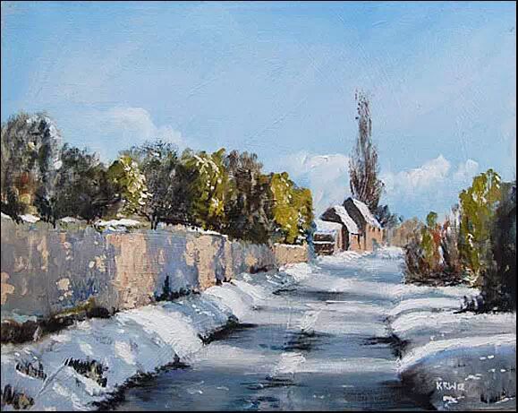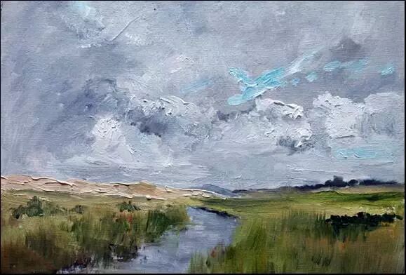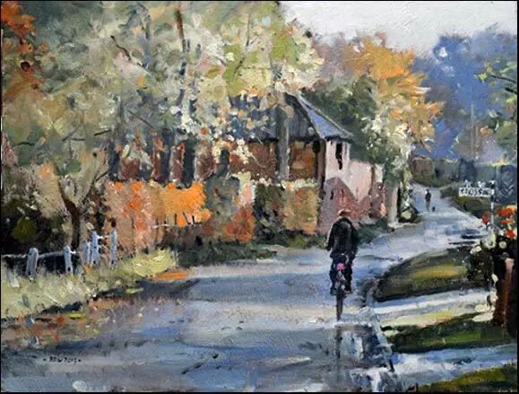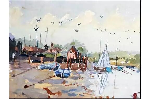 Kieron的画不同于其他同龄人的作品,他不喜欢用浓烈的色彩,也不喜欢对比鲜明的构图。事实上,无论是笔触还是选景,都让人深觉Kieron有超乎他年龄的成熟——灰黄色的天、蓝色的人、浅棕色的房子和黑白色的飞鸟,浅淡却不失层次。如果仅是出于对小画家的猎奇心态,Kieron的画作无法引起如此轰动。他的画作“总是含有一种超常成熟的忧伤”。他的大多数的画作描摹的是诺福克郡的小镇风光,这里有成片的草原绿树与明媚的天空,“我喜欢这儿,没有高山或丘陵,只有一望无际的天。”