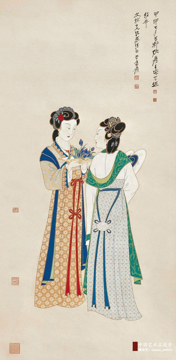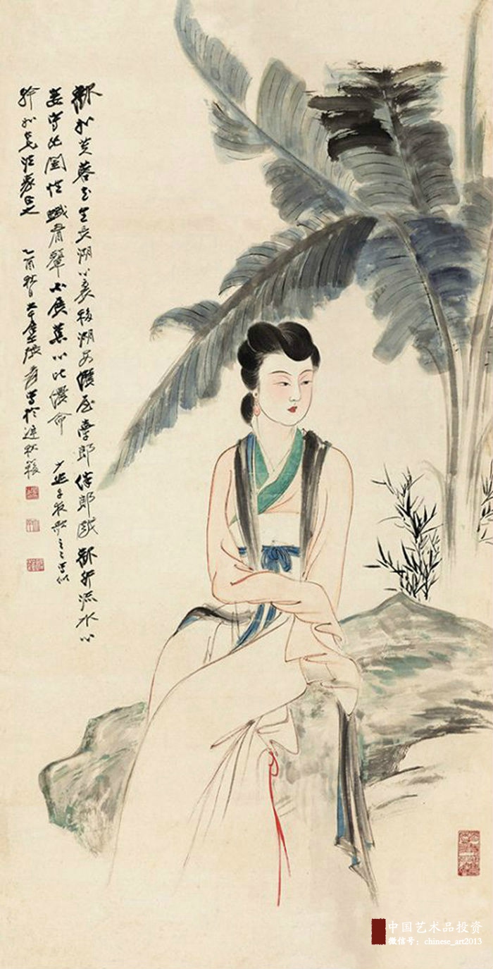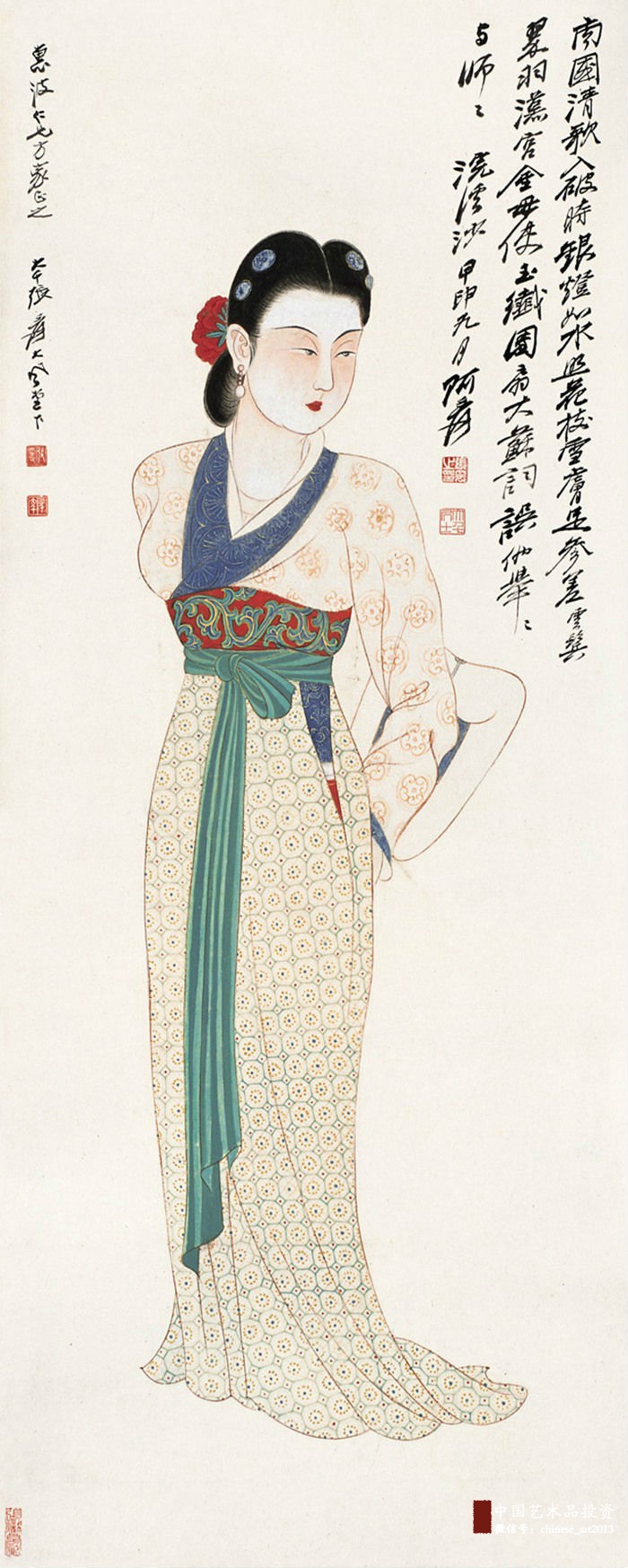 張大千 荷花屏風美女 1966年張大千自己曾謙虛地說過,他不敢說自己最能欣賞女人的美,他隻是在觀察、欣賞美麗的女人以搜求畫稿時,比別人更仔細、更留心罷了。他的仕女畫之所以能雅俗共賞,成為他繪畫題材中大受歡迎的一類,與他對美人的“美”刻畫得淋漓盡致、神髓逸出,密不可分。他眼中的美人標準可要比常人苛刻得太多,不僅要長得美,而且氣質要“嫻靜娟好,有林下風度,遺世而獨立之姿,一涉輕蕩,便為下乘”。因此能入他畫中的美女,當真是絕對美極了的。張大千 三美圖 1930年著名的京劇大師梅蘭芳上妝後的臉譜及身段被張大千認為“渾身都是畫稿子”。因為這種臉譜和身段凝結了唐宋以來古人們審美的全部精華。如美人的臉要“三白臉”才好看,也就是額頭、鼻子和下顎是白的,這樣才能襯托出臉頰的紅潤和健康。這種認知很符合自然美的原則,顏色的深淺會突出臉形的輪廓,中國人的輪廓大都顯得扁平,而“三白臉”正好表現出了線條輪廓的對比度,當然就顯得美。因此戲妝便尤其突顯出這個特點來。張大千 魚籃大土像 1944年對於外國人認為中國女人鳳眼好看的審美認識,張大千自有一番見解:“其實大家都弄錯了,鳳眼並不是像我們四川人所說的‘絲毛綢子上拉了一道口子’那樣的細長,所謂鳳眼是指女人的眼神要溫柔,不要瞪大眼睛,顯得一副凶相。”可能隻有大師才能如此入木三分地透過狹義上的“鳳眼”形狀,以眼神的種種流盼說出真正的“鳳眼”含義。張大千 執扇仕女 1938年五官之外便是人的身材,一個美人的高矮胖瘦該如何定下標準呢?張大千認為以中國人的審美習慣來看,並沒有特別的偏愛“胖子”或“瘦子”。所謂“環肥燕瘦”的典故強調的其實是“骨肉勻停”,勻稱就是美。國畫中的美人穿的都是古裝,飄逸輕盈,因為古代女人的衣服有彩帶、有水袖、有流暢的線條美,因此入畫。而時裝本身總在變,所以時裝的美都是暫時的,便有過時之說,因此不容易入畫。張大千說衣服穿得一臃腫,人就不美了。所以棉襖是入不得畫的。張大千 雙美圖 1944年20世紀30年代在北平時,張大千和梅蘭芳是相互欣賞的好友,梅蘭芳曾請教大千教他如何畫美人,大千當即回答:“你自己就是一個最標準的美人,你隻要把你戲台上的各種樣子畫下來就行了,千萬不用再參照別的樣子了。”梅蘭芳也是個對美精益求精的人,在他的練功房裏四壁都鑲滿了鏡子,每一舉手投足都力求達到最美的效果,甚至連唱時都要研究怎樣才不影響嘴形的美。除了臉和身材外,手是僅次於眼睛的傳遞情感最重要的工具。中國畫中有“畫人難畫手,畫樹難畫柳,畫獸難畫狗”的說法。道出畫手的難度。張大千 柳蔭仕女 1941年張大千在敦煌臨摹壁畫時,看到唐朝人畫女人時,不論丫頭、還是太太,都把手畫得細膩傳神,絕不偷懶。古人的治藝嚴謹讓張大千欽佩之餘更感身受鞭策,因此也練就了畫手的絕活。台灣的著名影星林黛不僅長得美麗,還生就一雙纖細柔美的手,但一般人隻注意到她的美麗麵容而把那雙美手忽略了。張大千便在畫給林黛的肖像畫上著意畫出那隻手的百轉柔情來,讓林黛自己都大為喜愛,還因此特地去照相館拍了張突出手指線條的照片。可惜美人命運多舛,後來因情自殺,讓遠在國外的張大千很是震驚與惋惜。張大千 仕女 四屏張大千自己的手不太好看,手指又粗又短,皮膚也稍黑些,但就是這樣一雙像經常勞作人的手卻畫出了無數美輪美奐的作品。而跟隨張大千的女人們則無一例外都有一雙漂亮的纖手。楊宛君的手尤其美,令張大千心動。張大千把和楊宛君的戀情稟告父母後,希望他們這次能夠同意,父母十分清楚兒子的心跡,知道同意是早晚的事,便答應下來。因為黃凝素生育太多,孩子的拖累讓她不能經常跟隨張大千外出照顧其起居,而大太太曾正蓉除了料理家務還要幫著照看小孩、侍奉公婆,張大千身邊的確是該有個人隨身照料和應酬。於是1934年的年底,張大千又添了第三個太太。張大千 拈花仕女圖 1954年楊宛君不僅容貌美麗,而且心胸大度,很明事理。娶了楊宛君後,張大千畫了不少以她為模特的仕女圖,張大千去哪兒遊曆都喜歡帶著她,她的個性中很有些落落大方的男孩兒氣,婚後她把兩條長辮剪成短發,有時故意穿男子的長衫,與張大千並肩走,後麵的人猛一看真以為是個男子呢。惹得她和張大千開心地大笑。張大千第一次去敦煌時帶著楊宛君,可過了一段時間,她卻提出要回成都。張大千奇怪地問:“你不是說嫁給了我,討飯也要跟著我嗎?”楊宛君說:“我不是怕吃苦,隻是你太專注那些洞窟裏的壁畫,根本顧不了我,四周又全是男人,我連個說話的人都沒有,悶死了!”張大千此時恍然大悟,這才突然發現楊宛君的麵龐已經蒼白和瘦削,張大千充滿歉意地說:“對不起宛君,這裏的確太荒涼了些,委屈你了。”於是在第二次再赴敦煌時,又帶出來二太太黃凝素,兩個太太一起陪伴他在敦煌的大漠中。張大千 蕃女掣龐圖 1946年從敦煌回四川後,張大千與三太太楊宛君忙著安排日常生活和對外應酬,整日地出雙入對、如膠似漆。黃凝素漸漸有些失落,想找個聽自己發牢騷的人都沒有,便愈加在麻將桌上沉迷。直到在牌桌上認識了一個年紀比她小很多的男人,讓黃凝素不可救要地陷在了不該發生的情感中。那個男人是個小職員,很務實功利的一個男人。他明白黃凝素落寞的