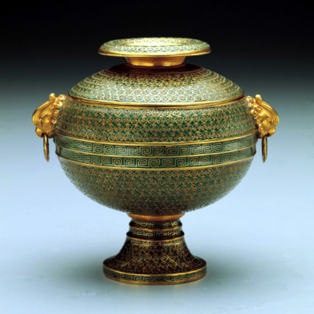 錘胎琺琅器的制作是按照圖案紋飾的設計要求,以金屬錘花加工技法對金屬胎進行加工處理,從而錘出圖案花紋,然后填施各種顏色的琺琅釉料,再經焙燒、磨光、鍍金而成。這種方法立體效果突出,琺琅釉料的晶瑩剔透盡顯。有的作品還鑲嵌綠色松石、紅色珊瑚等各種寶石,這樣,在金光燦爛的銅鍍金裝飾襯托下,五顏六色的琺琅釉料和晶瑩閃爍的各種寶石交相輝映,五彩斑斕,美不胜收。