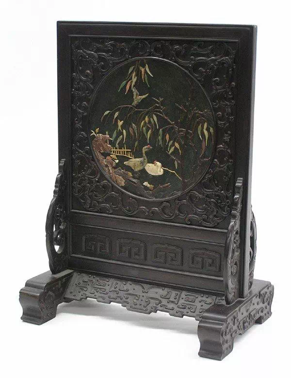【地屏】分爲座屏和落地屏,形體大,多設在廳堂,一般不會移動。座屏即插屏式屏風,是把單獨屏風插在一個特制的底座上,有獨扇、三扇、五扇等奇數規格,獨扇座屏與底座可連可卸,可卸的稱爲“插屏式座屏風”。
