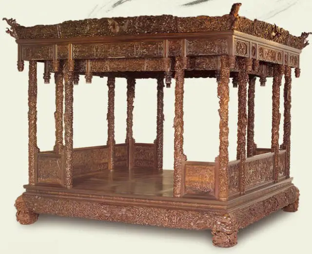它造型奇特,體積龐大,結構複雜,好像把架子床安放在一個木制平台上,平台前沿長出床的前沿二三尺。平台四角立柱,鑲以木制圍欄。還有的在兩邊安上窗戶,使床前形成一個回廊,回廊中間置一腳踏,兩側可以放置小桌凳、燈盞等。