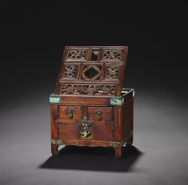 官皮箱是女子存放梳理和化妝用品的小箱子,並非官用,亦不是皮制,它形體不大,但結構複雜,是從宋代鏡箱演變而來的一種體量較小制作較精美的小型庋具。一般由箱體、箱蓋和箱座組成,箱體前有兩扇門,內設抽屜若幹,箱蓋和箱體有扣合,門前有面葉拍子,兩側安提手,上有空蓋的木制箱具。南方俗稱“梳妝箱”。