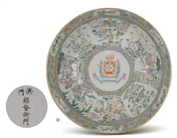 bowl),口徑41厘米,內外均繪八開光,開光內相間隔繪人物和花鳥紋。這類大碗歐洲人用于調制果酒,當時曾大量從景德鎮和廣州訂制。這兩件器物在顯要位置均繪有澳門總督府紋章,紋章由皇冠、葡萄牙國徽、飄帶組成,飄帶上用墨彩書寫葡萄牙文“澳門總督府”。器物底部用墨書“澳門總督衙門”楷書。据澳門博物館的同行介紹,這兩件文物原來一直保存在澳督府,在澳門回歸祖國后,由政府部門移交給澳門博物館收藏。