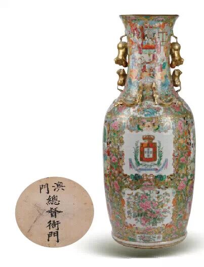 澳門博物館收藏的廣彩瓷器中,比較特別的是兩件帶有澳門總督府紋章的器物。一件是同治時期的廣彩人物花鳥紋雙獅耳大瓶,殘高97厘米,原來的花瓣形撇口因殘破已被磨去。另一件為嘉慶道光時期的人物花鳥紋潘趣碗(punch
