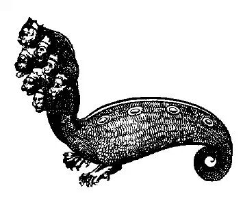 有學者認為,七頭蛇代表天主教教義里的七宗罪:傲慢、妒忌、暴怒、懶惰、貪婪、暴食及色欲。希腊神話中,九頭蛇的頭少則兩頭,多則百頭。七頭蛇也出現在《新約聖經·啟示錄》第十二章,被描述為紅色巨龍,七頭十角,每個頭上都帶著一副皇冠。澳門大三巴教堂浮雕七頭蛇被認為是描繪撒旦。撒旦(Satan)指《聖經》中的墮天使,或稱墮天使撒旦。他是反叛上帝耶和華的墮天使(Fallen