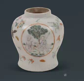 澳門博物館收藏的几件耶穌會標志瓷器包括有青花罐和粉彩罐、瓶等,均為清代制品,由博物館出資購藏。這几件器物都在背面繪耶穌會標志,正面紋飾則各不相同。其中粉彩瓶繪的是祥云天使圖,其余空白處滿繪傳統中國式花鳥紋。粉彩罐正面開光內繪《聖經》牧羊人故事,四周繪花蝶紋。青花罐的主題紋飾有繪荷花、聖經故事等。這類瓷器紋飾呈現出明顯的中西合璧特征,應為當時的教堂或神職人員訂制,用于教堂擺設或使用。它們在國內其他地方和國外都很少見,美國皮波迪艾塞斯博物館(PEM)收藏有一件此類瓷器的凈水碗。