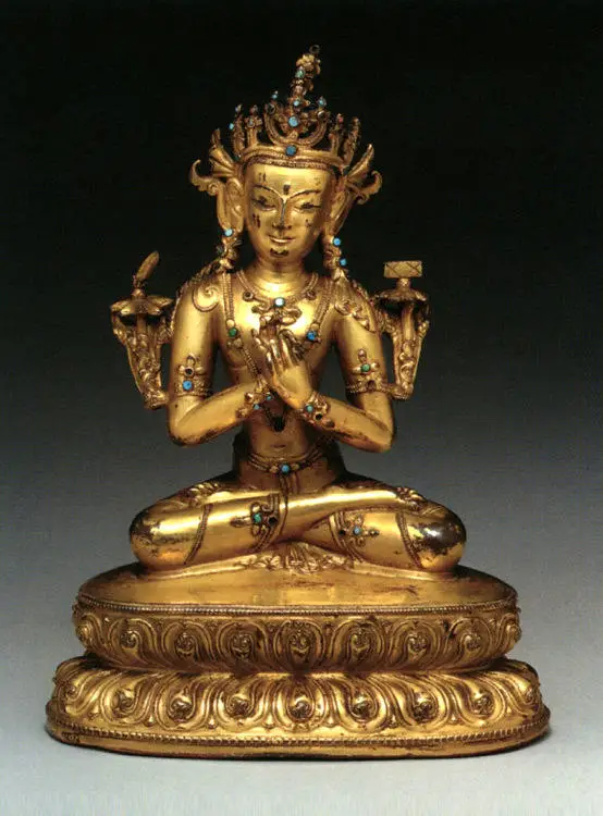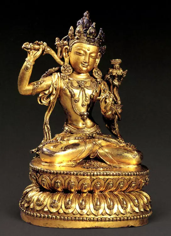 傳銅鎏金秘密文殊菩薩坐像,大明永樂年宮廷製作,清宮舊藏,通高 525px ,底寬325px ,底厚 227.5px ,北京故宮博物院收藏。此坐像一頭四臂,面相方圓豐滿,雙目俯視,神態莊嚴。頭戴五葉寶冠,袒上身,細腰束裙,披肩長帛垂掛於前臂。主臂右手上舉持劍,左手結期克印牽蓮花莖,另一右手持箭,左手上舉持弓,肌膚豐滿,姿態端正,全跏趺坐。座面陰刻“大明永樂年施”楷書款。