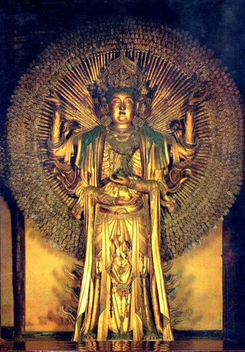 明代雕塑珍品:千手千缽千釋迦文殊菩薩立像,像高8 米左右,山西太原崇善寺收藏。文殊菩薩立像身後由無數手臂組成相輪,每隻手中都托著一隻金缽,每隻金缽中都端坐著一尊釋迦佛像,而且每尊佛像都精雕細刻,一絲不苟,不愧為我國佛教雕塑藝術的傑作。