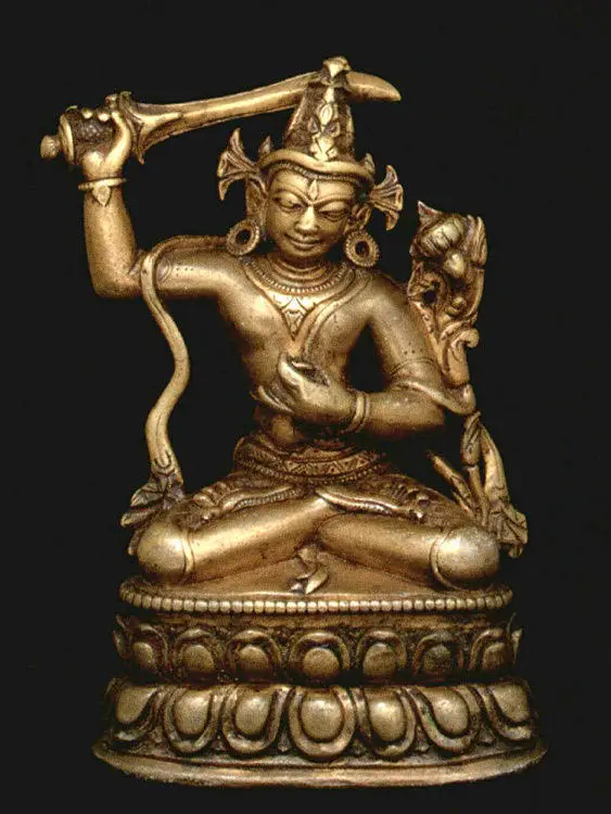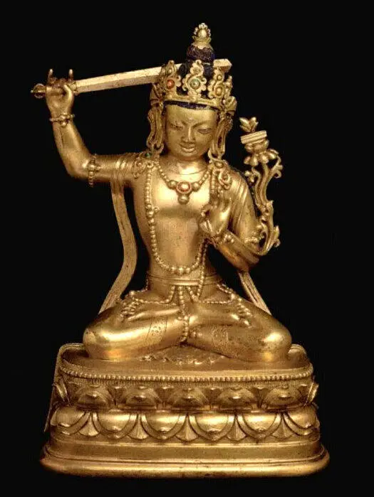 西藏佛像:文殊菩薩坐像,黃銅鎏金,單體澆鑄,海外西藏佛像典藏。文殊菩薩全跏趺坐於蓮花寶座之上。左手當胸持一株蓮莖,蓮花開於左肩,上置經書;右手高舉持寶劍。經書和寶劍是文殊菩薩的重要標識。
