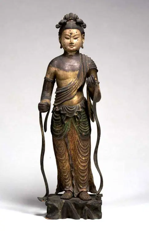 紀鎌倉時五髻文殊童子立像,像高 1082.5px ,東京國立博物館收藏。五髻文殊以消災為本願,右手執智慧之劍(已失)、左手持梵篋(已失),斜披聖帶。頭頂五髮髻十分可愛,圓圓的臉龐,微瞇的雙目,睿智、安詳又顯童趣。披帛繞臂飄逸而下,為靜像增添了動感。腰繫寬大長裙,繪水波衣紋,長裙內雙腿隨衣衫而起伏,非常寫實。