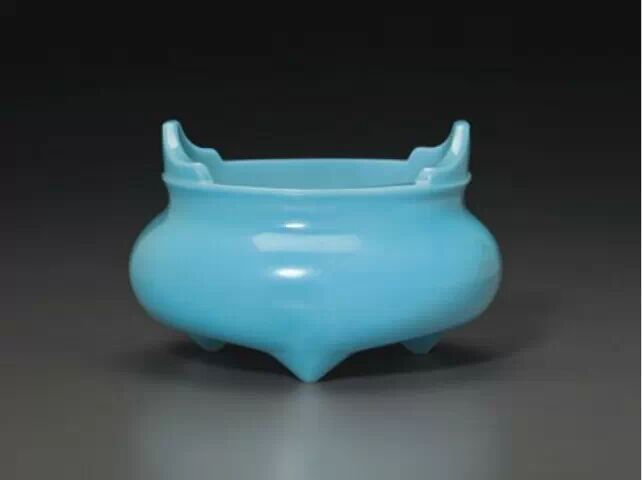 清乾隆天藍色玻璃三足爐方框《乾隆年製》楷書刻款直徑:11.1 cm
