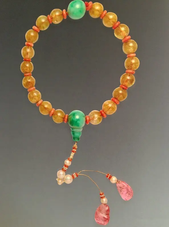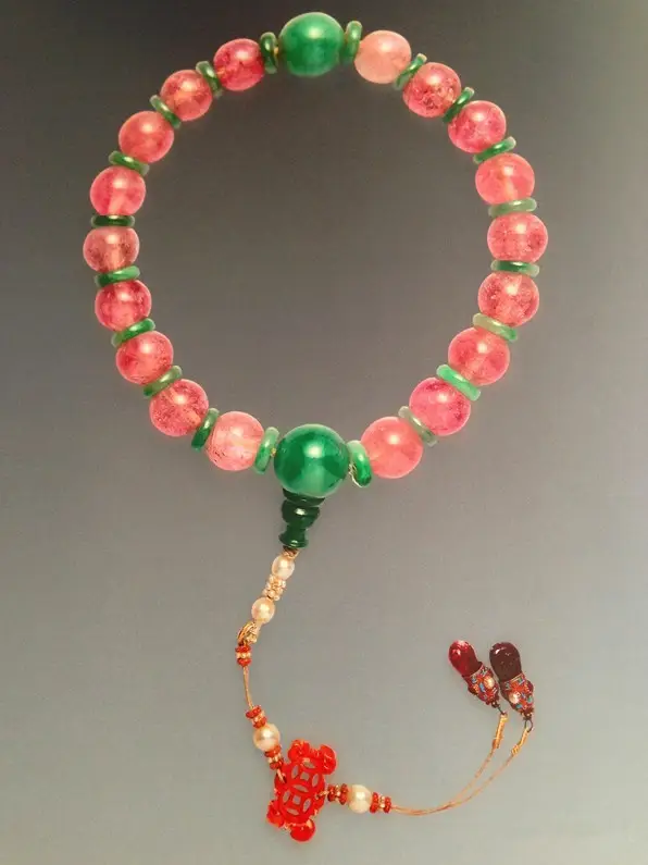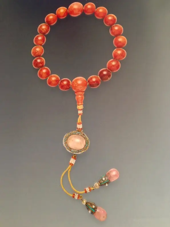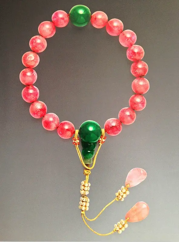 手串,源自念珠。清宮中的手串,選材多用珊瑚、碧璽、翡翠、青金石、瑪瑙、蜜蠟、水晶等材質。佛頭、墜角多用翡翠、珊瑚、珍珠、碧璽裝飾。