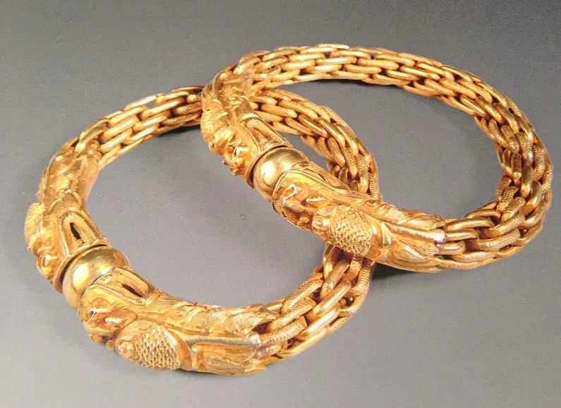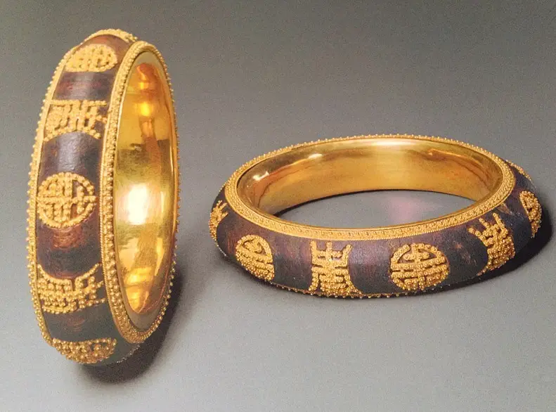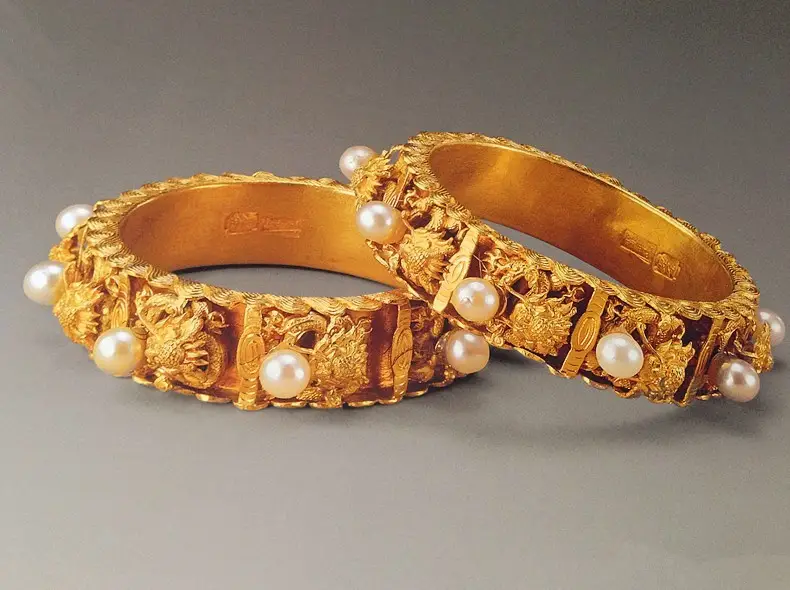 手鐲的紋飾題材一如其他清宮首飾一樣,言必有意,意必吉祥,多是蝙蝠、佛手、萬字紋樣,期盼福壽康寧。