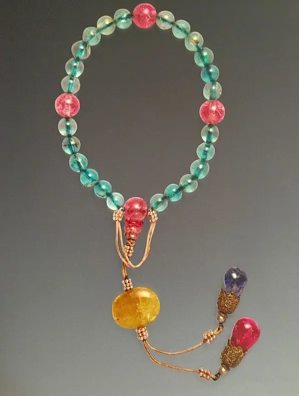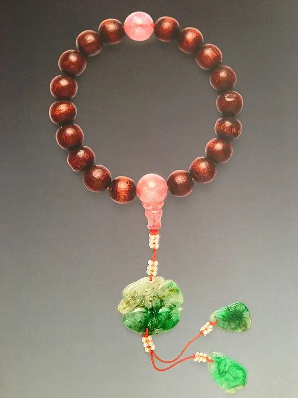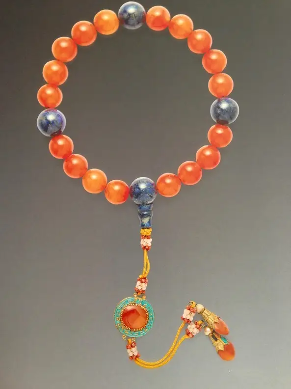 現存清宮舊藏的十八子手串,部分佛頭位置係有掛扣,結合清代宮廷后妃肖像畫與晚清后妃照片,發現手串在戴於手腕之外,也被懸掛在衣襟扣絆,手串佛頭位置的掛扣,即是為了這種佩戴方式而專門設計。
