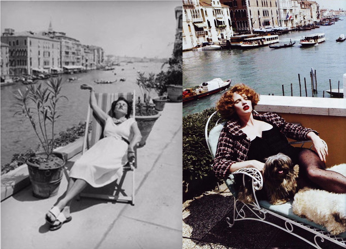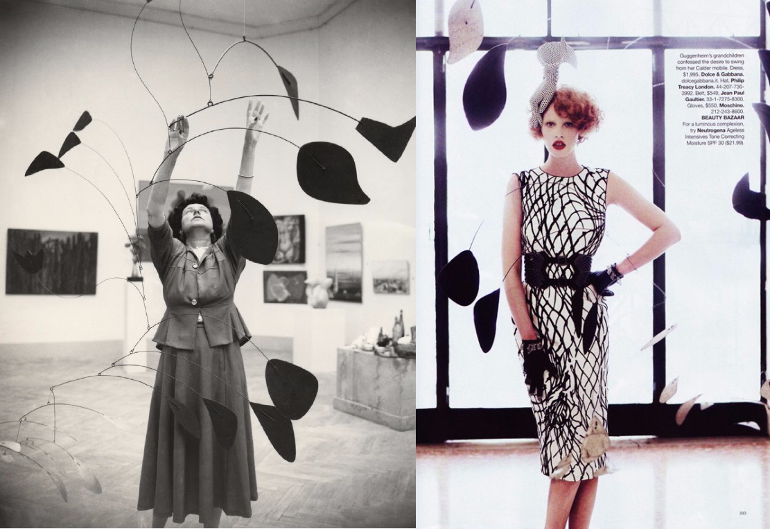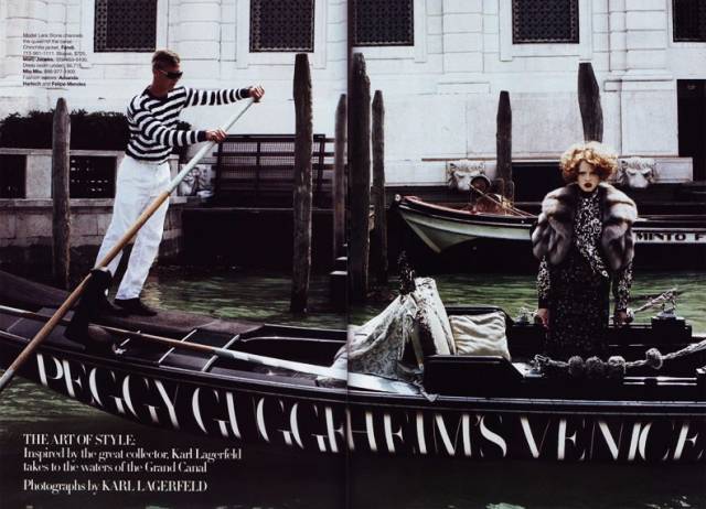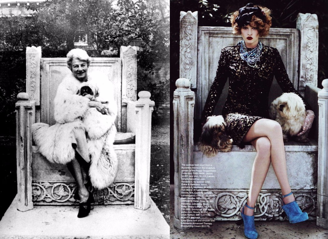 2009年八月的美版《時尚芭莎》中,有組老佛爺Karl Lagerfeld親自導拍,石頭姐Lara Stone出鏡的大片。他們致敬的人,便是Peggy Guggenheim。