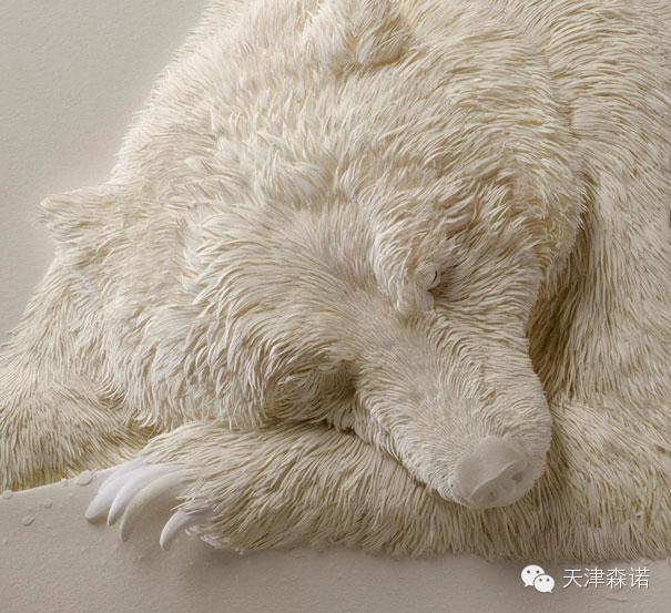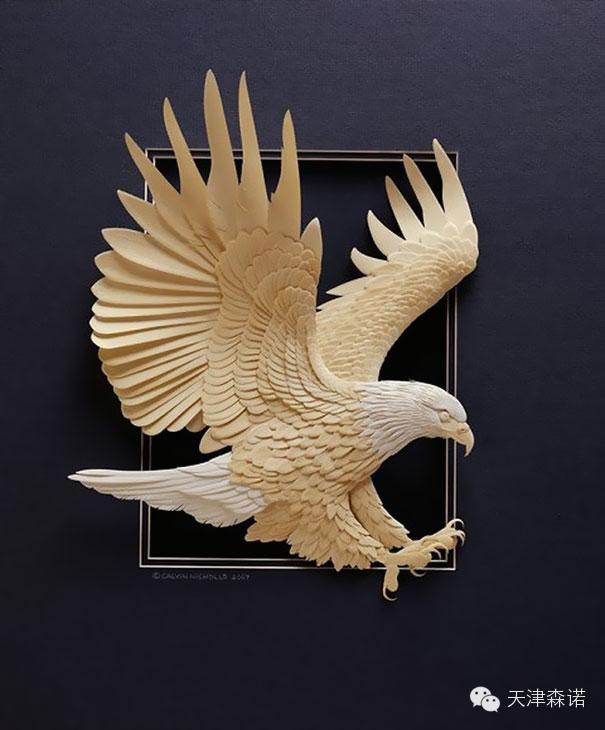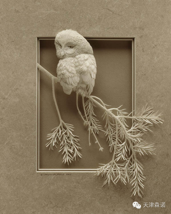 Calvin Nicholls是一名加拿大紙雕藝術家,手術刀片和紙是他工作當中不可缺少的工具,將畫好的畫,逐個切成單個部件,最後將他們組合在一起,再用攝影燈打光調整淺浮雕效果,在展廳內的燈光下他的紙雕立體感顯得格外明顯,尤其是紙張雕塑的微妙形式和紙張特有的質地會讓我們為之驚嘆。他的作品被許多國際藝術機構、私人收藏家、出版商購買並已在北美各地畫廊展出。