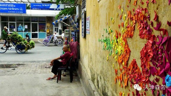 Mademoiselle Maurice的街頭藝術作品,貼附在街頭巷尾的彩虹摺紙,顏色搭配鮮活亮麗,三維的摺紙也顯得立體飽滿,似乎還會隨風搖擺,充滿勃勃生氣,讓原本到處水泥有些漠然的城市街頭頓時充滿了生趣與童話感。執行可謂簡單至極,亮點是把玩生活、享受快樂的創想,恰恰這正是現在都市裡最最缺乏的。