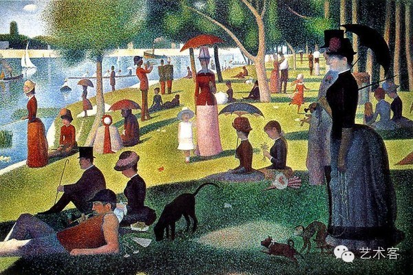 新印象派:新印象派是印象派的直係親屬,但又有所不同。相較於印象派,新印象派不那麼注重瞬間的感官印象,而是用係統的色彩理論和技法繪畫。比如點彩畫派的技法:不調色,隻用四原色的色點的疊加給人整體的感官印象。看看喬治修拉(Georges Seurat)的這幅《A Sunday Afternoon on the Island of La Grande Jatte》