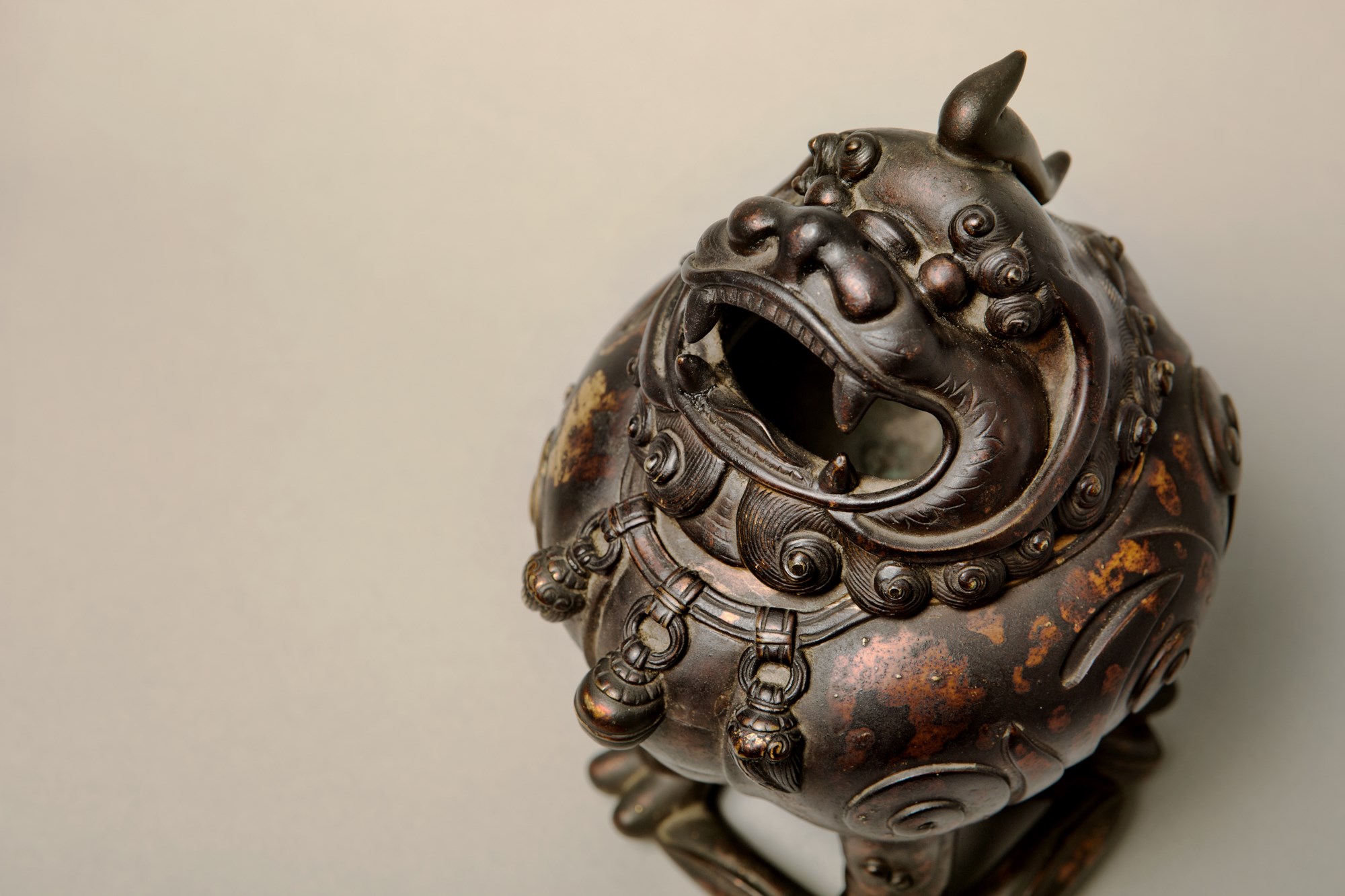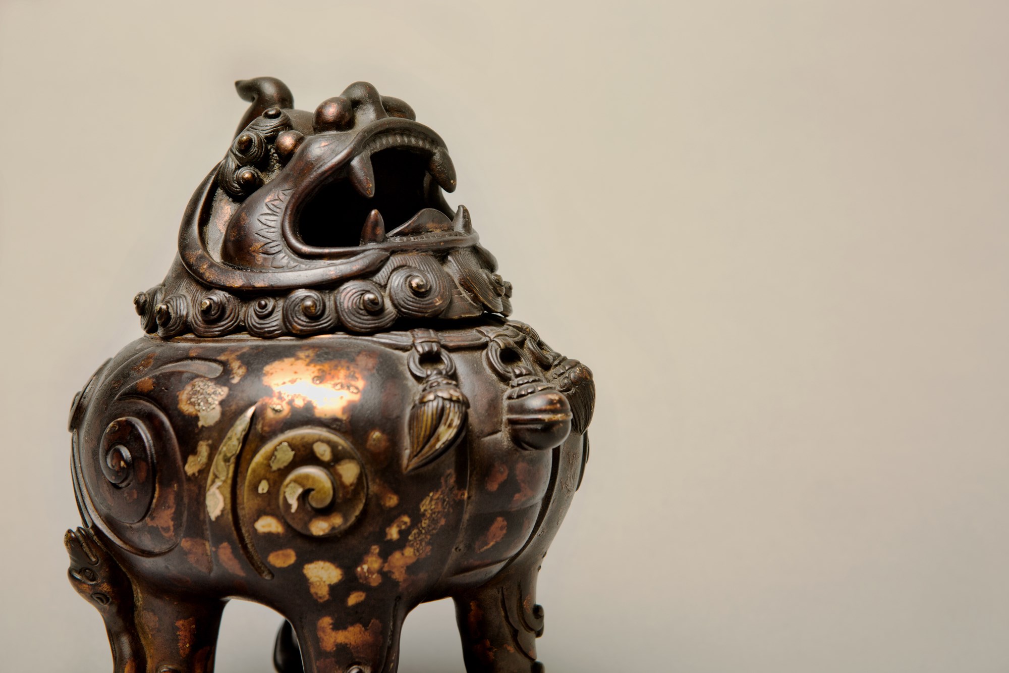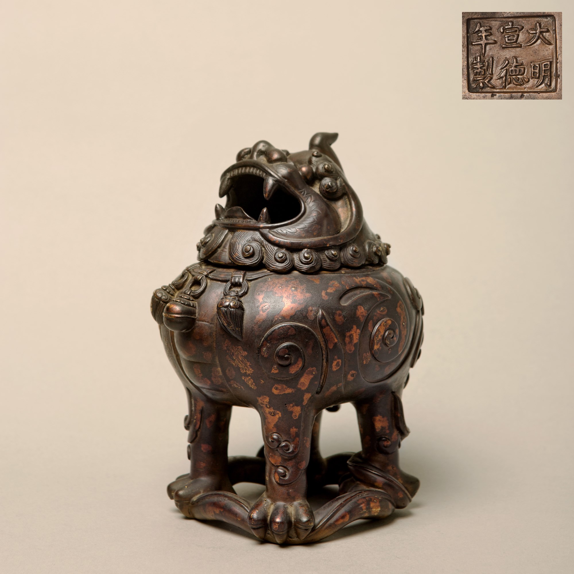 爐甪端型,獸目鼓凸,炯炯有神,圓鼻朝天,挺括飽滿,髮鬢丰盈,蜷于頸間,陰刻為飾,刀工細膩,角在鼻上,《說文》有云:“堪作弓,李陵曾以此弓十張遺甦武也”。頭與身分兩段,宜添燻香。獸身渾圓微扁,周身浮雕火焰紋及如意云頭紋,紋飾蜿蜒至足,胸前鈴鐺瓔珞,身后龍骨高聳,牛尾盤結,四足挺立,利爪緊扣一尾蛟龍,此組合在甪端型爐中甚是少見。爐精工細鑄,獸神態生動,紋飾細膩,匠心獨運。腹下開框,鑄「大明宣德年制」六字楷書款。 甪端最早見載于《史記•司馬相如列傳》,非為瑞獸,后至宋明時期,演化為明君聖主當政之吉兆,亦多見于瓷塑、琺瑯器。《宋書》有載,“甪端者,日行萬八千里,又曉四夷之語,明君聖主在位,明達方外幽遠之事,則奉書而至”,民間引申,又有吉祥如意,風調雨順之義。