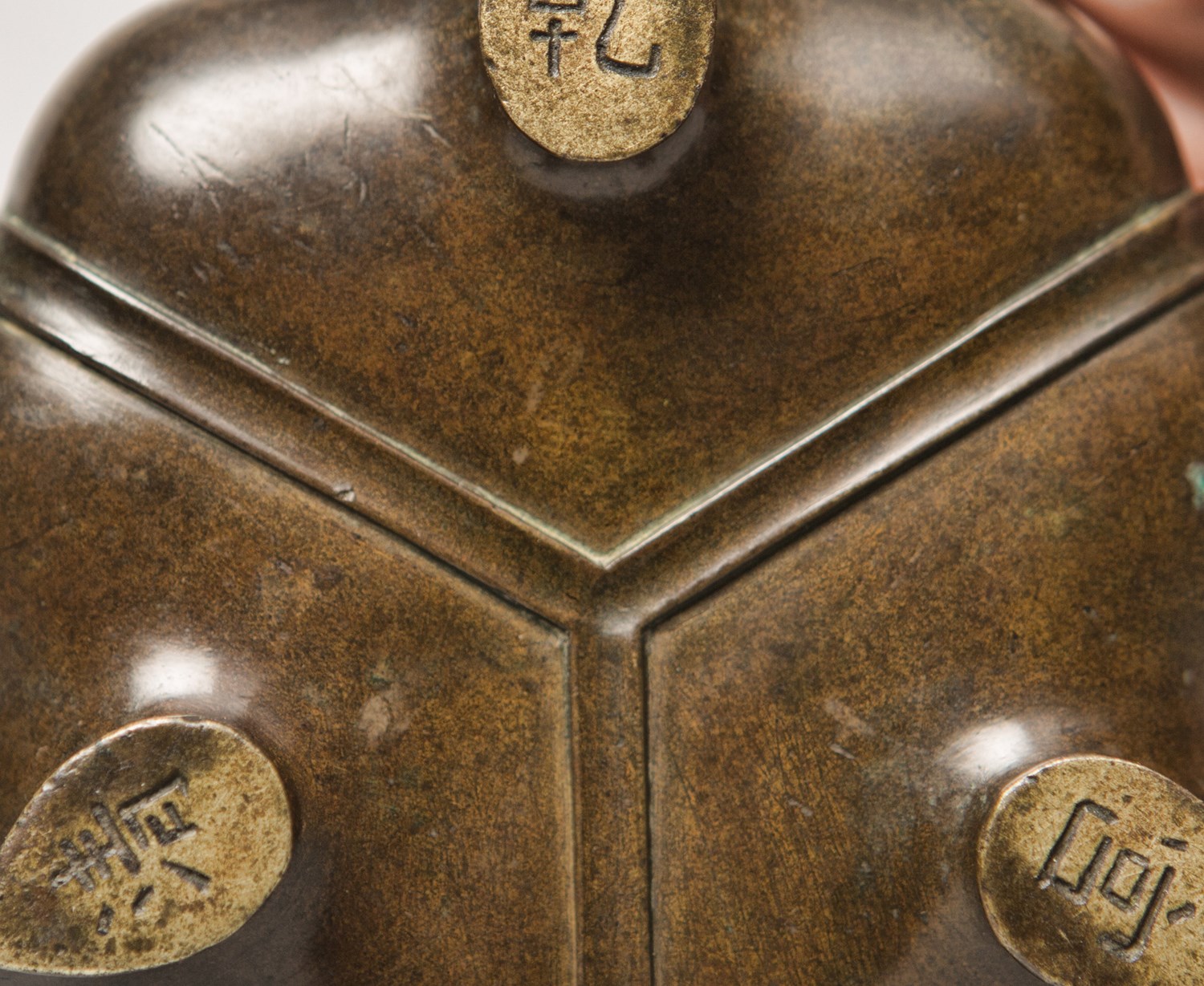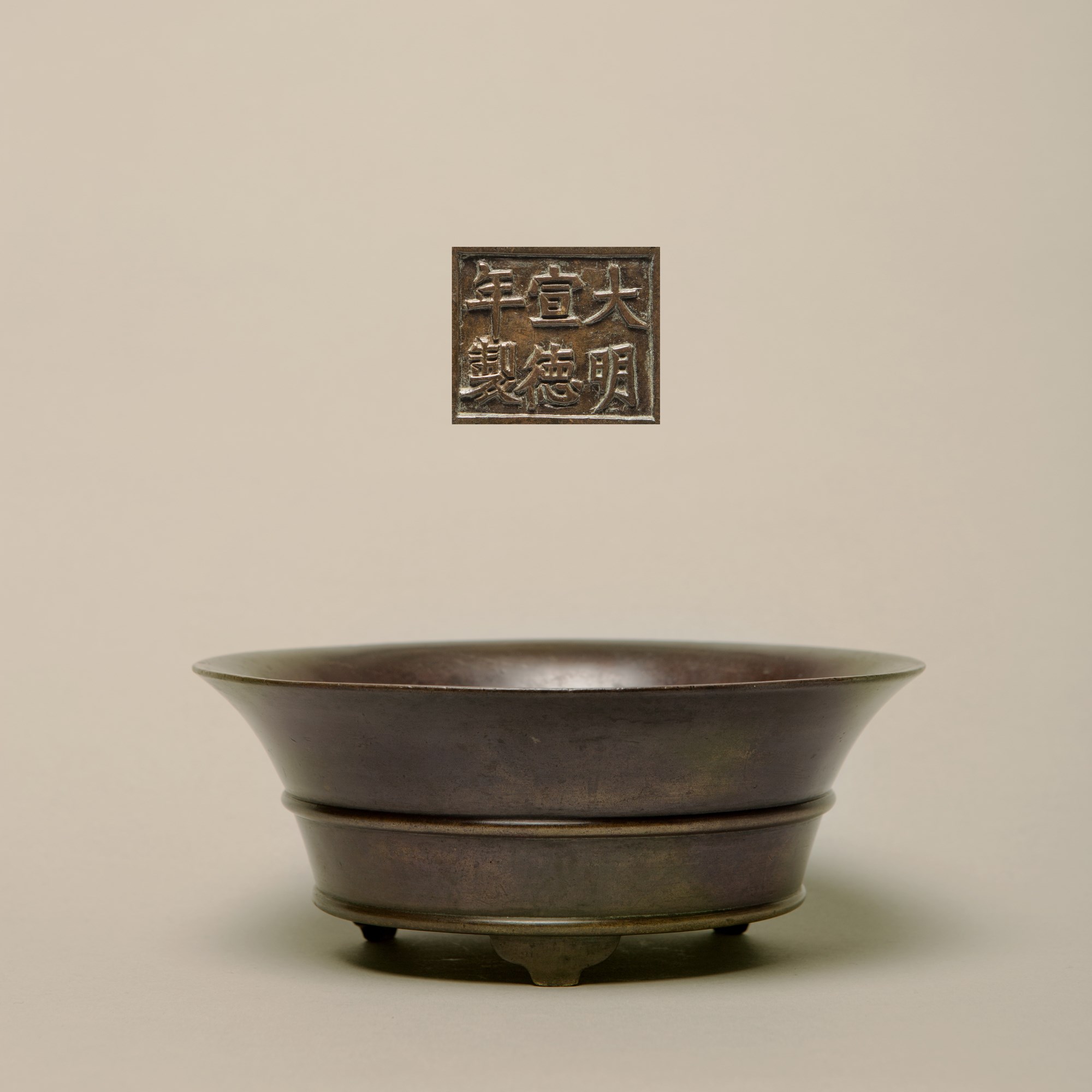 常見盆式爐款,多為仿宋代汝窯水仙盆,圓盆爐則甚為罕見。爐腹下與近底處起凸弦紋兩道,線條飽滿圓滑,器壁自底足向口沿漸薄,口沿微弧外撇,曲線圓融,比例諧美。爐身下承以三云板足,紋飾素雅簡洁。底刻「大明宣德年制」六字楷書款,撇捺舒展,筆意十足,為明代晚期款識風格。爐通體蜡茶色,原皮完好,精光內蘊,縴塵不染,寶氣內涵,百年風雨,未侵一隅。銅質精密,壓手感重,輕叩薄沿,有金石之聲。此圓盆式爐應為打篆香而制。唐時起,有以篆字型做香,為計時用,此類圓盆式爐,口徑寬闊,最宜篆香。若更燈夜讀,品蜡茶皮色,觀篆字漸消,尤覺古意盎然。