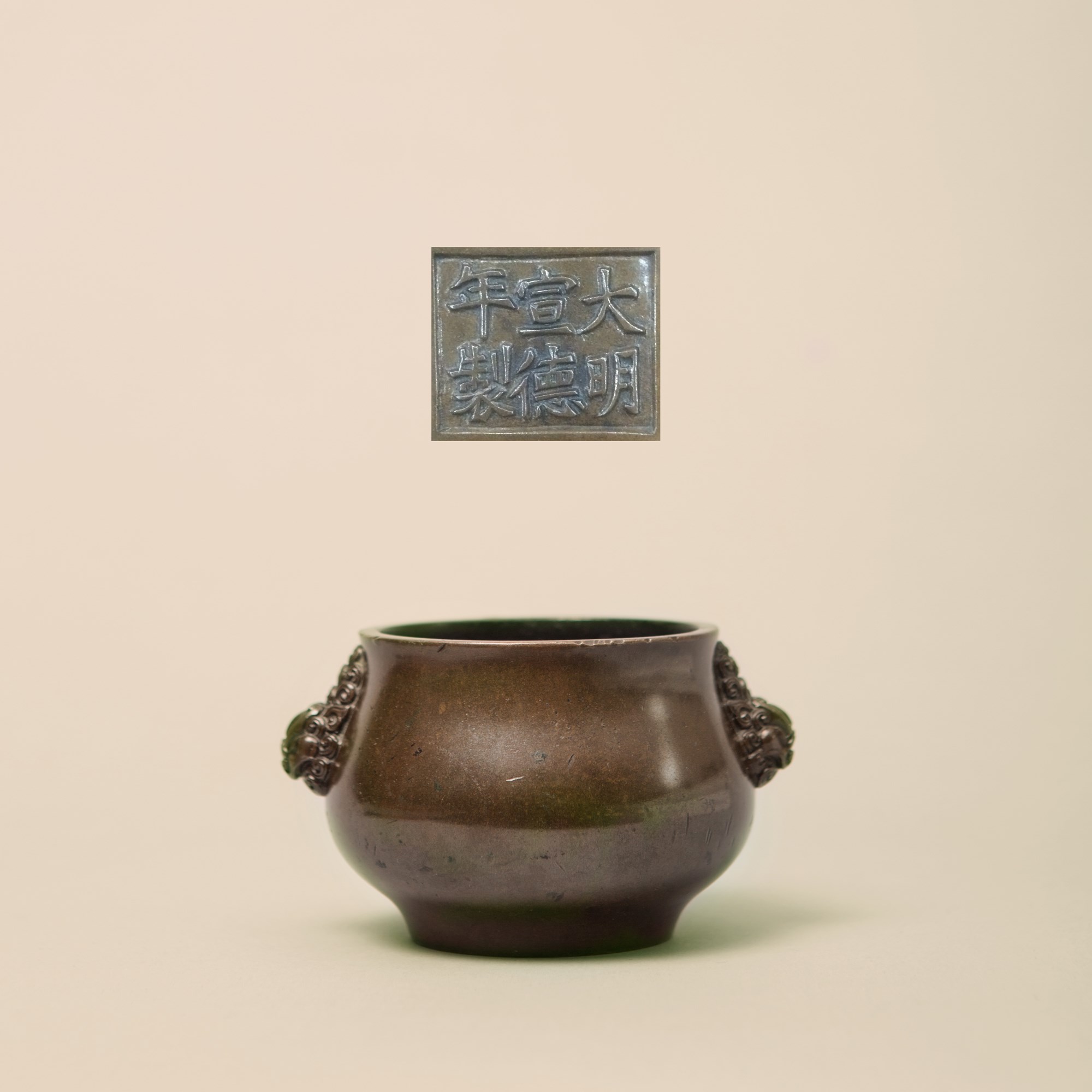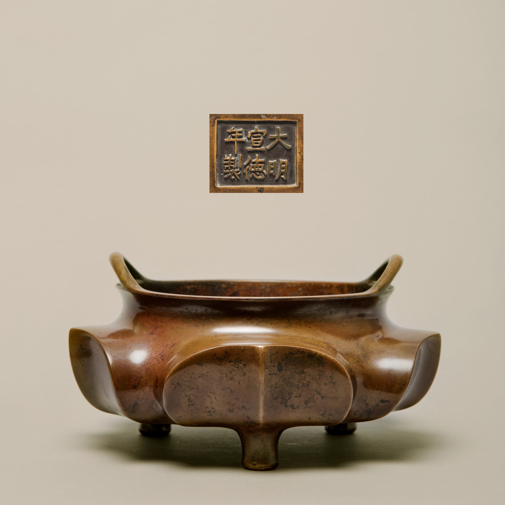 爐薄沿外侈,上出縴細虎眼橋耳一對,頗為精巧。束頸下弧,腹部出五瓣花囊,接頸處圓潤平滑,折角處線條清晰,起棱處挺括有致,精工細鑄。腹下承以三足,挺拔有力,器底開框,鑄「大明宣德年制」六字楷書款,款字稚拙,鑄造深峻,為典型晚明風格款識。此爐為一體鑄造,又為大器,僅工藝之精,用銅之巨,在明代晚期傳世品中便十分罕見。 宣爐最妙在色,色最妙在原皮。此花式爐通體蜡茶色,不見損傷,不經褻玩,原皮完好,殊為難得。其色淡淡穆穆,精光內涵,不需冰消之晨,夜光晶瑩映澈,僅置於案上,屏息以觀之,便可見玉毫金粟隱躍于肌理之間,迥非他物可以方比。花式爐起源於明嘉靖萬曆時期,此時商業興盛,市場活絡,文人參與工藝品的設計與製作,不單銅爐一項,漆器等物亦自此時起多現仿生造型,突破了器物早期簡約、質朴的樣式,風格更為多變。此件橋耳花式爐,即為此風潮下鑄造的佳品。