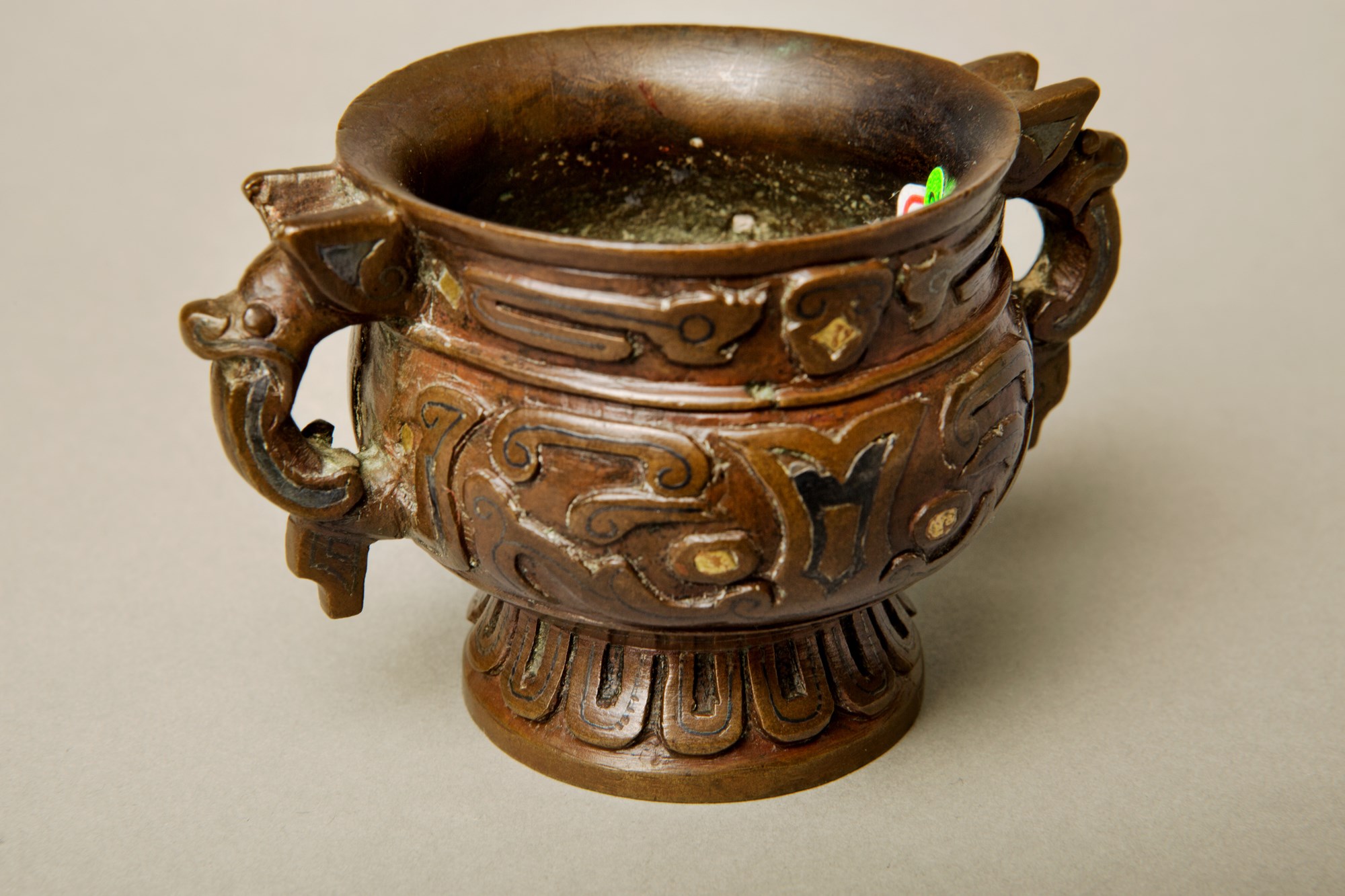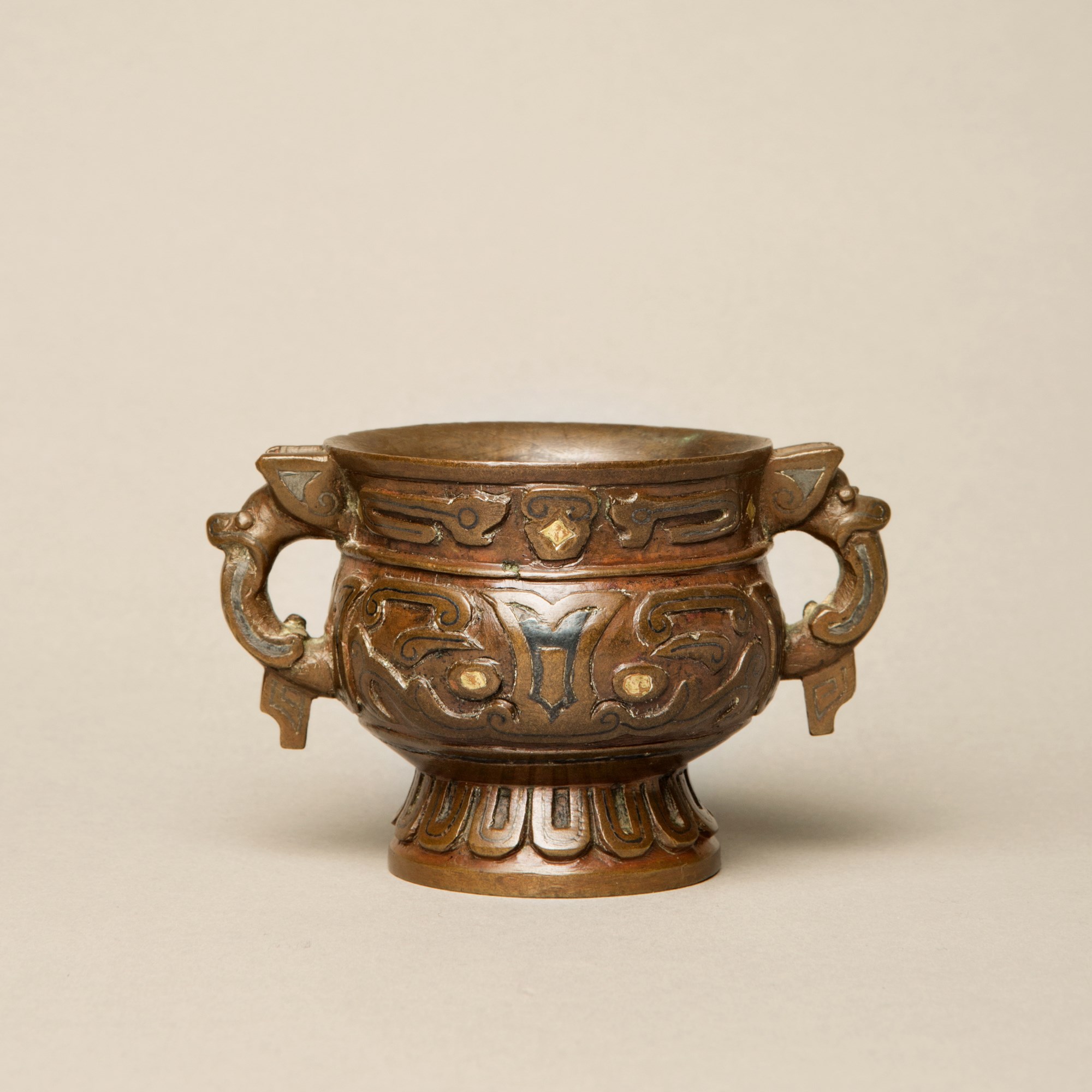 小爐仿上古青銅簋式,爐身飾浮雕饕餮紋,雙目、眉心、耳孔處金,周身紋飾錯銀,此類裝飾方法多見於明代晚期,為仿宋代銅器所做。小爐無款,內堂與器底為青綠銹斑所附,古意盎然。爐雖小巧,但銅質精煉,壓手感重,置於掌中,宜賞宜玩。