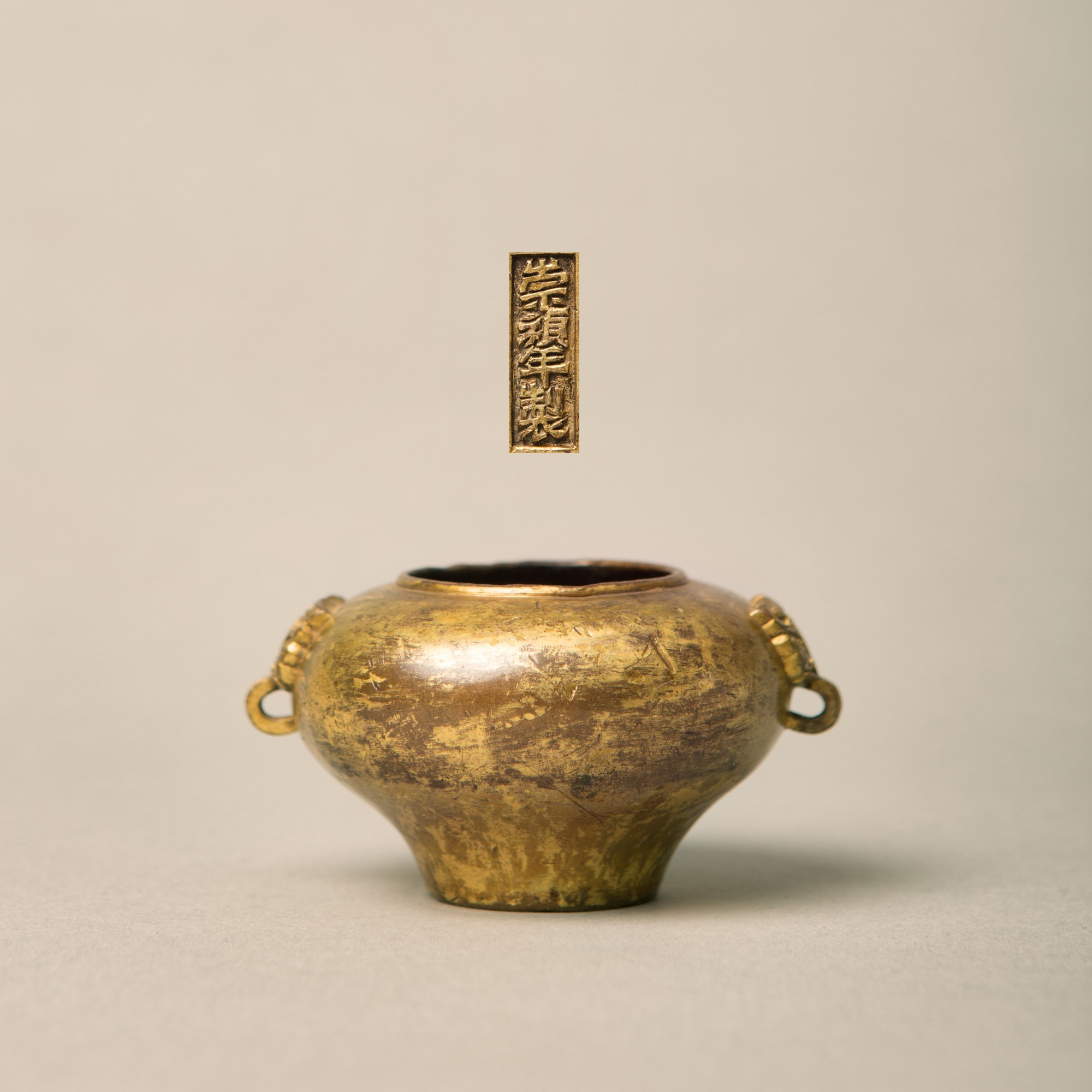 爐缽式,口沿起線,下承丰肩,縴腰緊窄,平底內窩,身型挺拔高峻,在缽式爐中較為罕見。丰肩兩側一對鋪首銜環,獸面高聳,鑄刻深峻,云頭成發,圓卷成鬢,怒目圓瞪,神態生動,為晚明雕刻佳品。爐通體鎏金,直至底足,小器大樣,壓手感重,器底開框,鑄「崇禎年制」四字楷書款,款字清晰,平底素凈,佳爐佳款。