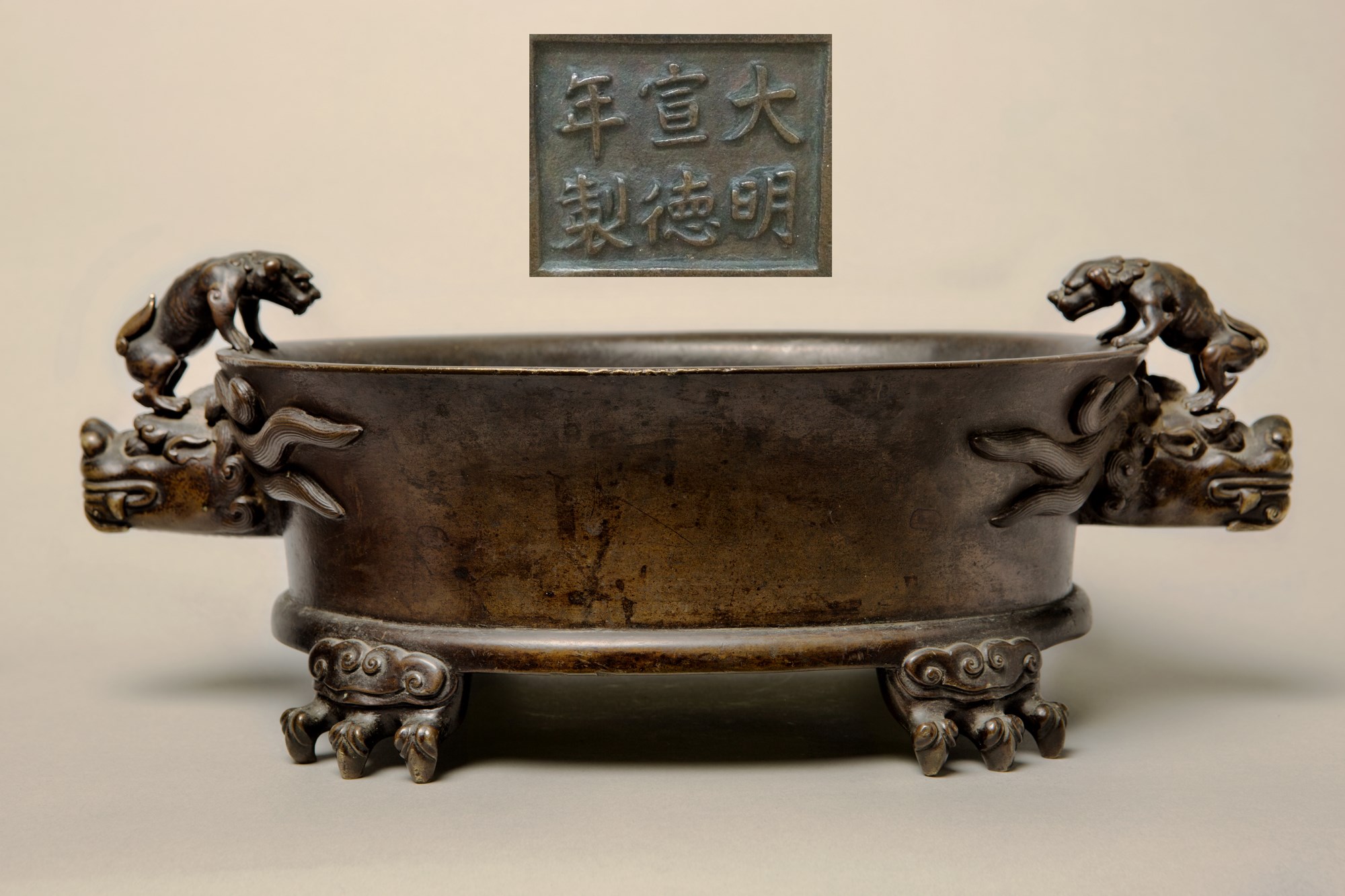 爐水仙盆式,身側一對雙獅踩龍耳。獅首相望,窺測盆內,雙耳微垂,髮鬢團卷,丰鼻挺括,雙目炯炯,身形隆拱,惡骨嶙峋,背脊高聳,獅尾緊翹,雙爪緊扣口沿,威武有力。獅身下腳踩龍首,圓目闊鼻,龍鬚團卷,雙耳后揚,神態祥和,髮鬢丰盈,蜿蜒于水仙盆上,飛揚靈動。盆下承以四獸足,足上飾如意云頭紋,利爪見骨,堅實外撐,抓地有力。器底開框,精鑄「大明宣德年制」六字楷書款,款字清晰,鑄造深峻。 水仙盆式爐多見螭龍雙耳,如此爐雙獅踩龍款者极其罕有,獅首窺探盆內的造型,可見於萬曆時期紫砂器上,時代特徵明顯。爐上裝飾一體鑄造,均斜刀軟刻以飾,肌理飽滿,神態生動,盡現冷工藝的高超技巧,為明代中晚期銅藝雕刻的巔峰之作。