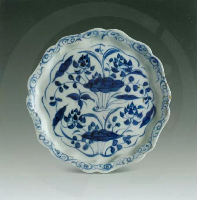 青花荷蓮紋葵瓣口盤