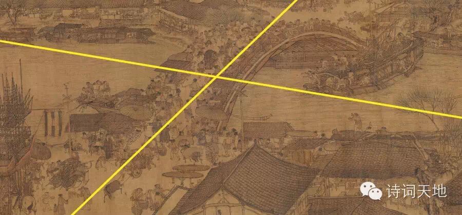 汴河和虹橋構成的X確定了畫幅的中間點,但並非視線聚焦點。視線聚焦點在橋下那隻客船左船頭。