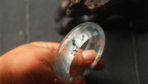 緬邊境經常見到白色,呈透明或半透明的“冰種”玉石,它常帶藍或藍綠花。顏色總體為白色或灰白色,具有較少的白斑和色斑,分布不均勻,色調偏藍偏暗。這種玉在云南稱為“水沫子石”,帶有色調偏藍的色調者稱為“水底飄藍花”。其外觀很像水頭好的冰種翡翠,特別是飄蘭花的品種。水沫子主要礦物成分為鈉長石及少量的輝石類礦物和角閃石礦物。它的致色物是按一定方向排列的陽起石、綠帘石。飄藍花中的“藍花”為角閃石礦物。用放大鏡觀察不顯翠性,含有較多的石腦或白棉,水頭很好,這是非常重要的特征。總體色彩為灰白或白色。水沫子石的硬度5.5~6,比重(2.57~2.64),比翡翠的比重(3.32)小得多。測定折射率為1.52~1.54。敲擊起來聲音沉悶,不如翡翠清脆。如用較硬的礦物刻划原料或半成品時,如用水晶刻划,水沫子很容易被划傷,翡翠則難以刻划。