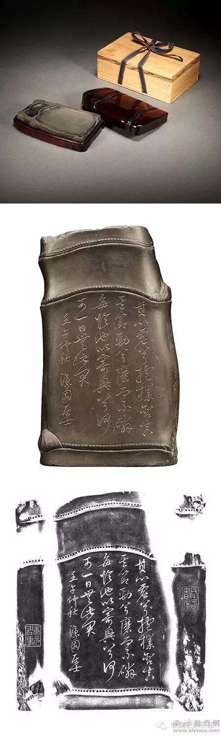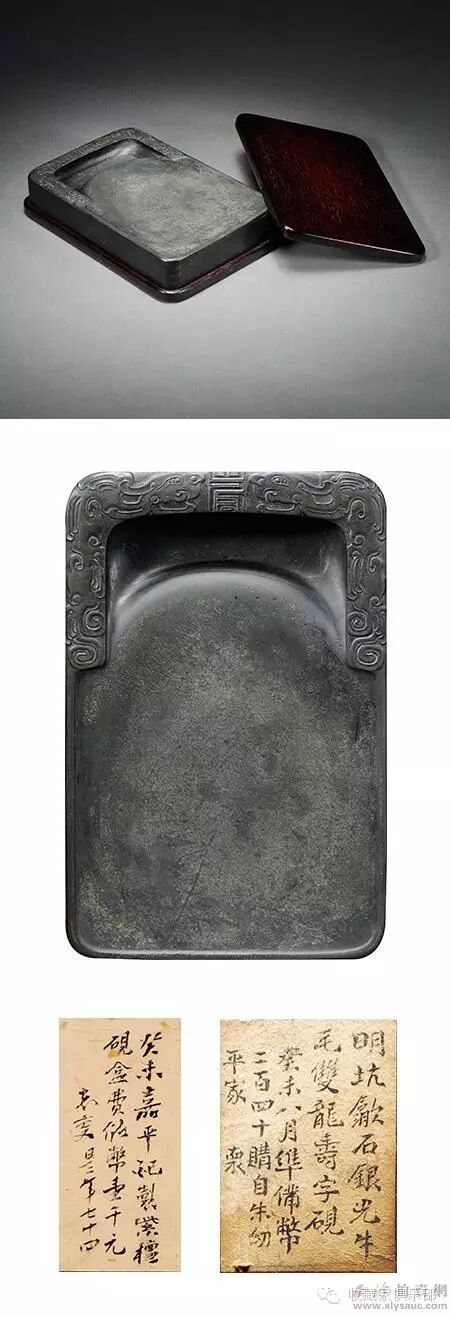 說明:1.硯為歙石,長方形,圓厚大方,開門字池,淺雕雙夔龍紋,硯額正中琢一壽字,成雙龍捧壽圖案,雕工文雅有古意。石色青灰泛銀光,並有細羅紋,叩之有金鐵之音,為歙石中上品。配紫檀木天地蓋,上有龔心釗題字小簽。
