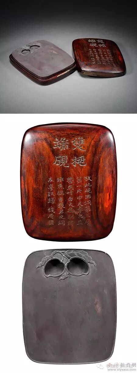 硯盒銘文:雙桃端硯。考此硯西洞第三層第一片,中天青色且帶蕉葉白、火捺、胭脂斑、魚腦,當張君之洞在粵取歸。錢庵。印文:剛
