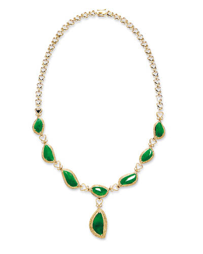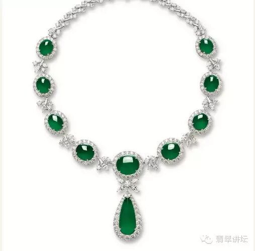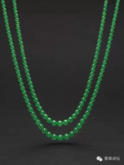 來自海外華僑珍藏之一套兩條相配之天然翡翠塔珠項鏈,項鏈上的每一顆珠子顏色均勻,細潤濃綠且晶瑩剔透,极為罕有奢華。此項鏈由多達254顆色澤、水頭、種質相配的翡翠玉珠組成