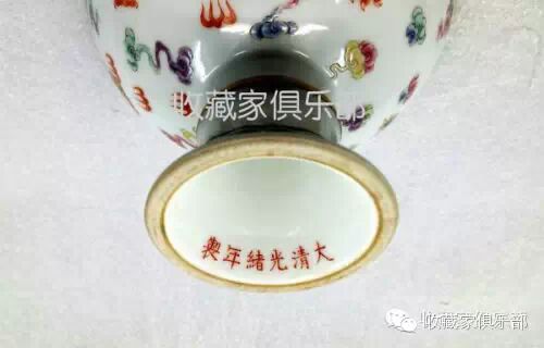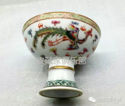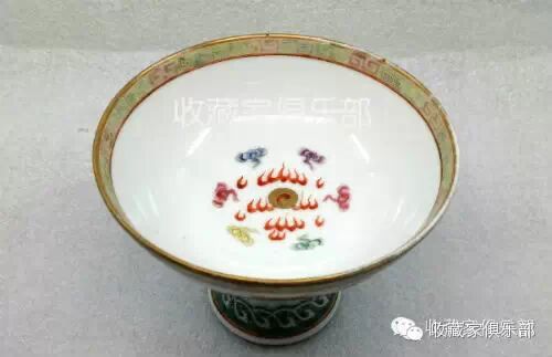 【藏品說明】藏品金口下內外皆施回紋並有金線,內底中央畫云火金珠,外壁畫龍鳳戲珠于云火之間,足外撇內空,中部凸起金色玄紋,足部飾綠色海浪波濤紋,下有金線。足內書有“大清光緒年制”一行紅色六字楷書。