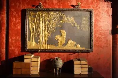 40.紫檀木邊鍍金竹林鶴兔圖挂屏 清代