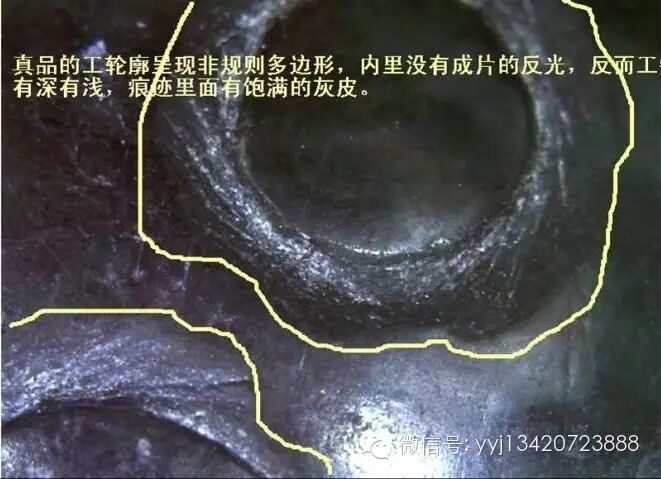 注意:仿品的工痕整體成片反光,工痕邊緣直線像齒划出來一樣,工痕內的“砣痕”极度平行。