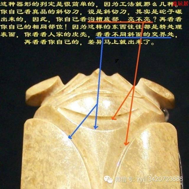 這種器形的判定是很簡單的,因為工法就那麼几種。你自己看真品的斜切刀,說是斜切刀,其實是砣子碾出來的,因此,你自己看溝槽底部,亮不亮?(上圖黃色箭頭),再看看你自己相同部位!因為這樣的東西往往都是精處理表面,你看看人家的皮殼,看看不同斜面的交界處(上圖藍色箭頭),在看看你自己的,差异馬上就出來了。