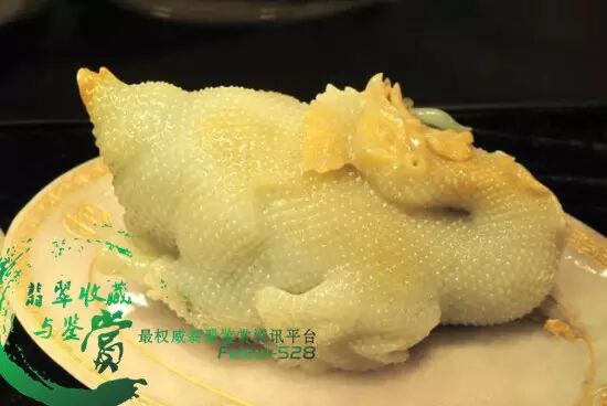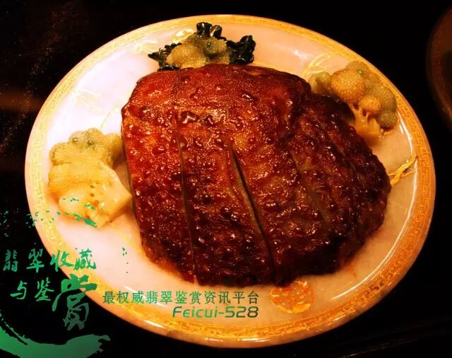 翡翠東坡肉。翡翠巧色運用逼真到了亂真的程度,而且永遠保持“醬色新鮮,肉感若香”的珍品本色,把視覺藝術轉化為“味覺”藝術,其構思和想像,就價值萬金。報價1500萬。