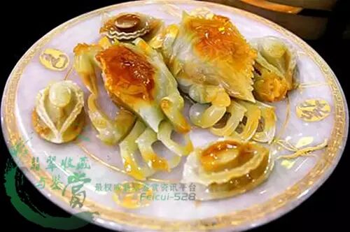 翡翠瑤池月餅。月餅裡面的餡子隱隱可見,種水好、坑種老,雕工精、構思絕,這種月餅恐怕只有天上的瑤池御廚裡才做得出來,報價3000萬!